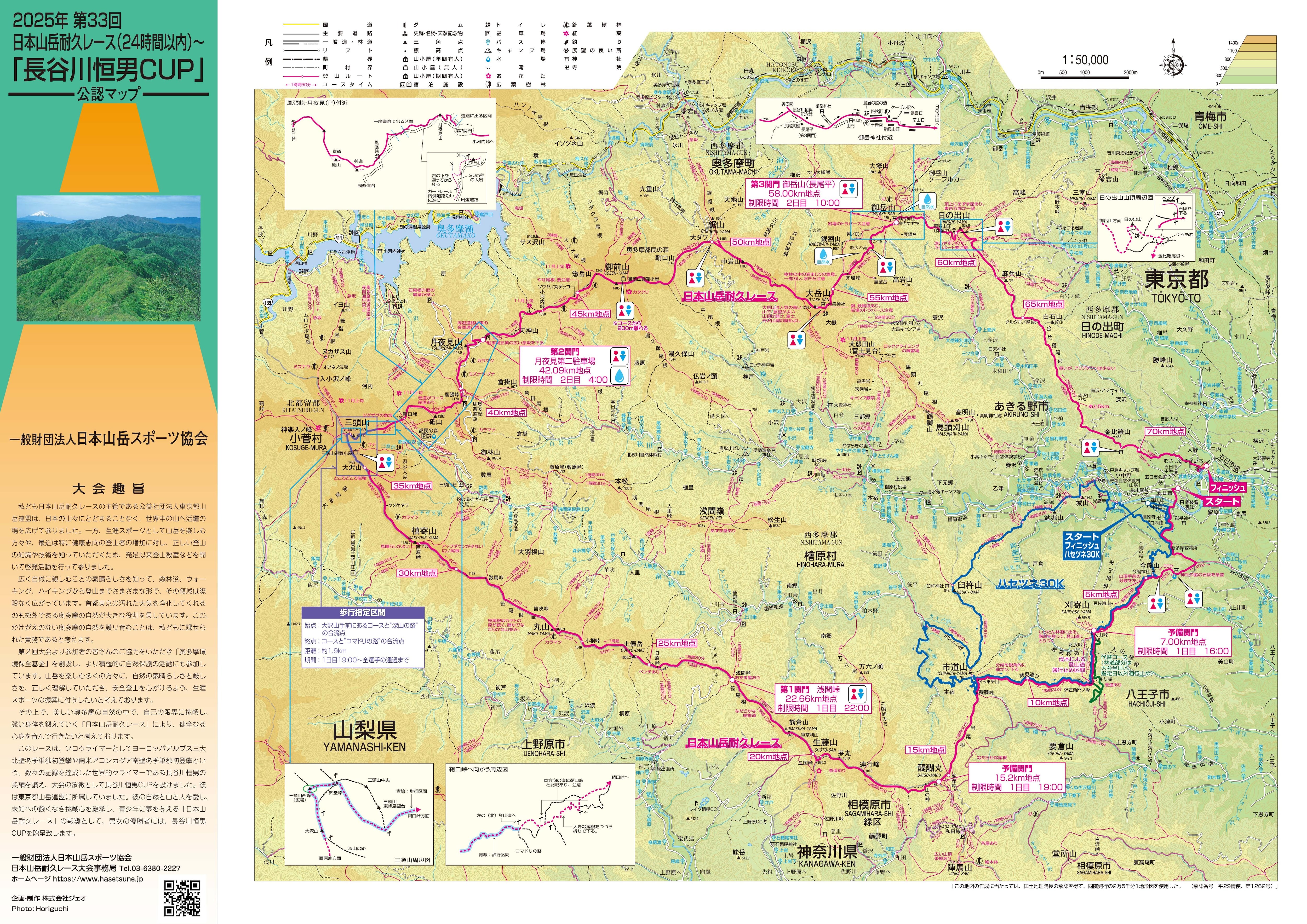 ハセツネCUPコースのトレイルは、武蔵五日市の市街から、浅間峠、西原峠、三頭山を経て、御前山、大岳山、御岳山、日の出山に至る全長約71. 5キロにわたります。大会ではこのトレイルコース全体図を公認マップとして販売しています。